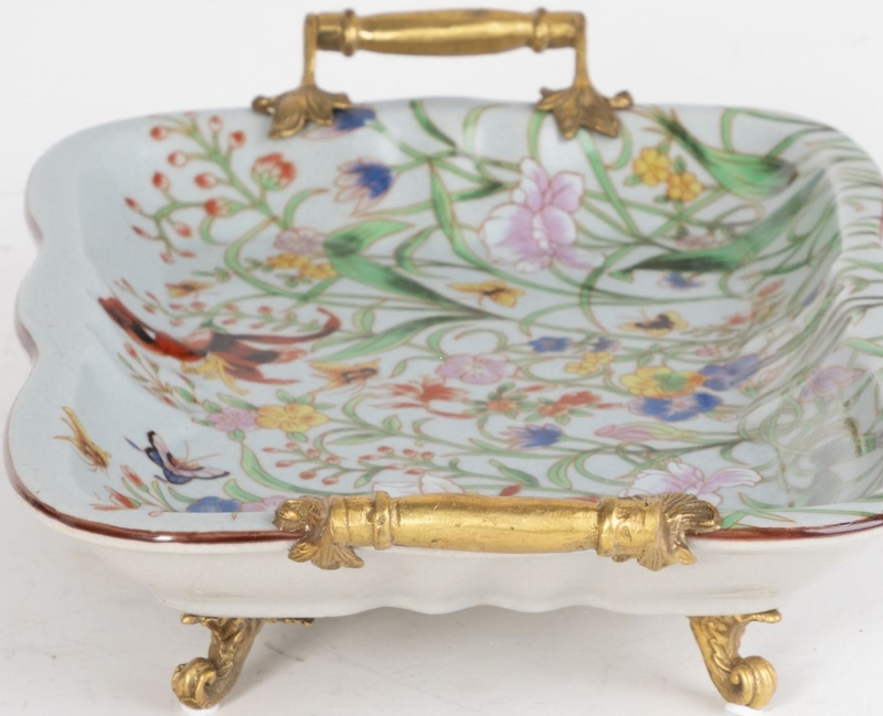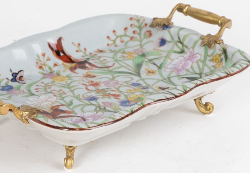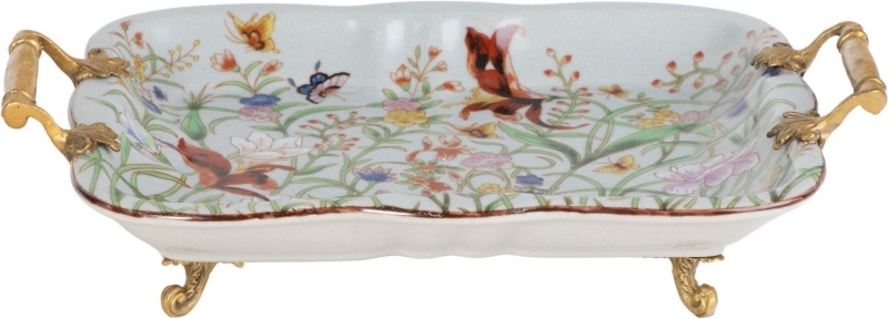 Изящное декоративное блюдо из фарфора сочетает тонкую цветочную роспись, мотивы птиц и бабочек, фигурные бронзовые ручки и ножки. Этот вариант идеально подойдет для консоли, журнального столика или витрины и поможет создать атмосферу утончённости и коллекционной эстетики.