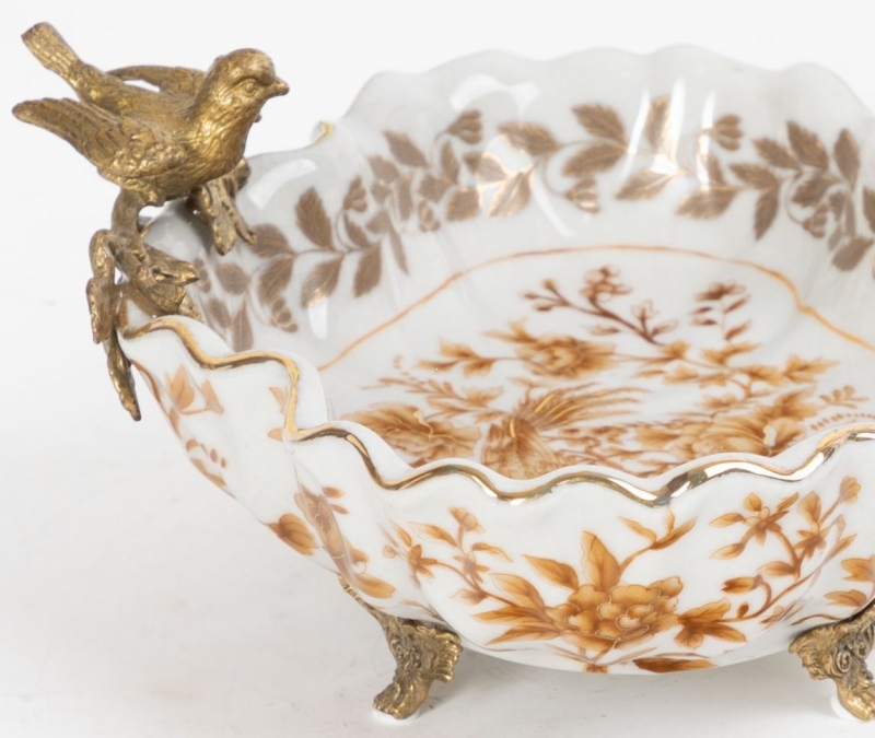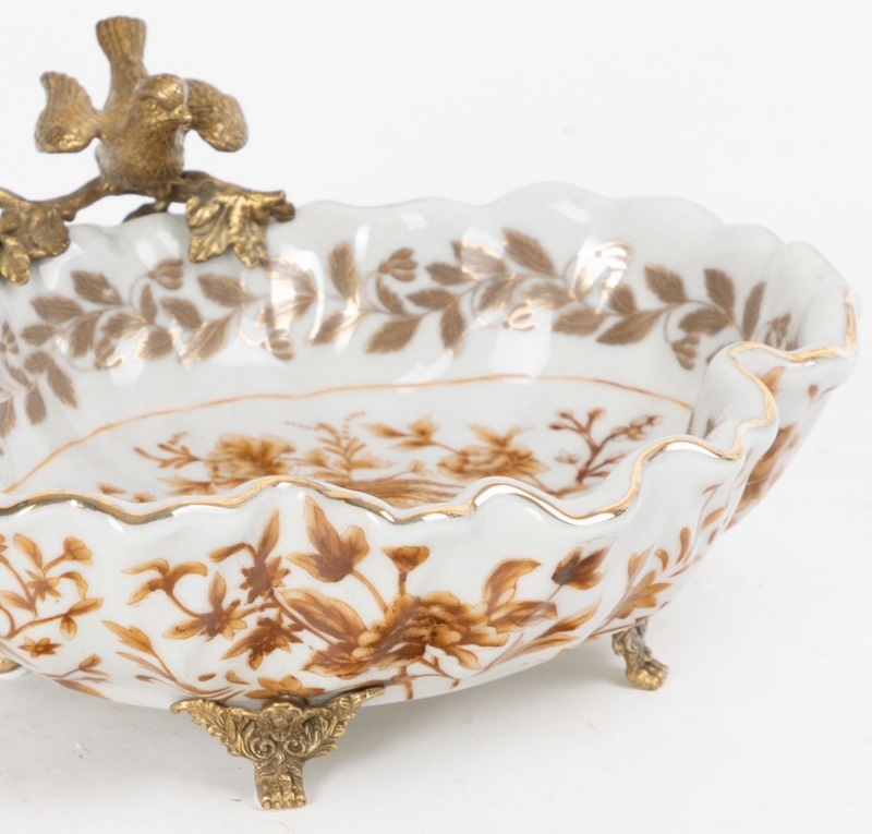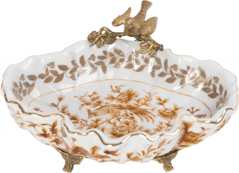 Изящное декоративное блюдо из фарфора с бронзовыми элементами добавляет интерьеру ощущение старинной роскоши и тепла. Этот вариант идеально подойдет для консоли, журнального столика или комода и поможет создать атмосферу утончённого уюта.