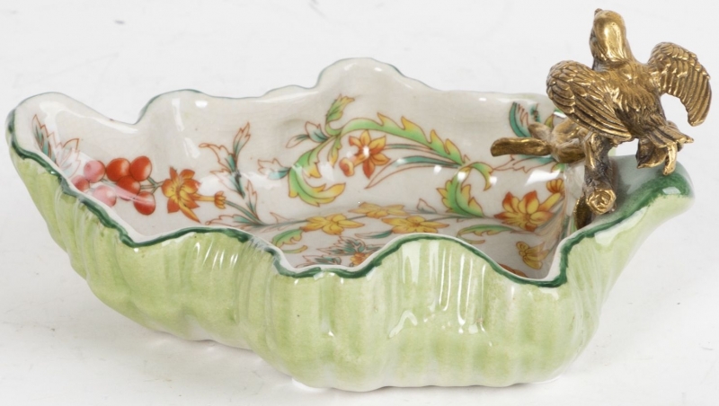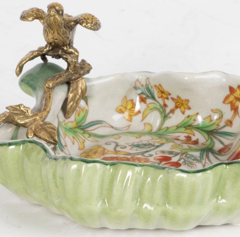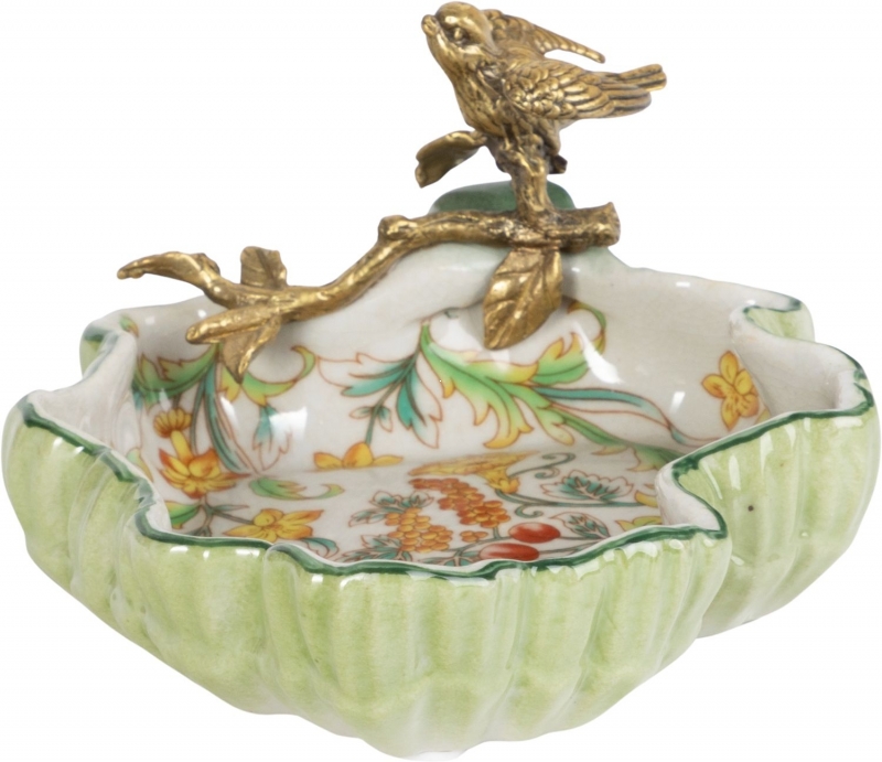 Декоративное блюдо Saga из фарфора в кремово-зеленой гамме с бронзовыми элементами сочетает плавную лепестковую форму, тонкую ручную роспись и выразительный скульптурный акцент. Край оформлен мягкими волнами и напоминает раскрытый цветок, а внутренняя поверхность украшена растительным орнаментом с желтыми цветами, зелеными завитками и теплыми терракотовыми деталями. Особую выразительность композиции придает фигурка птицы на ветви с листьями в бронзовом оттенке. Глянцевая поверхность красиво отражает свет, а декоративные кракелюры усиливают эффект благородной старины и делают образ более глубоким, живым и характерным.