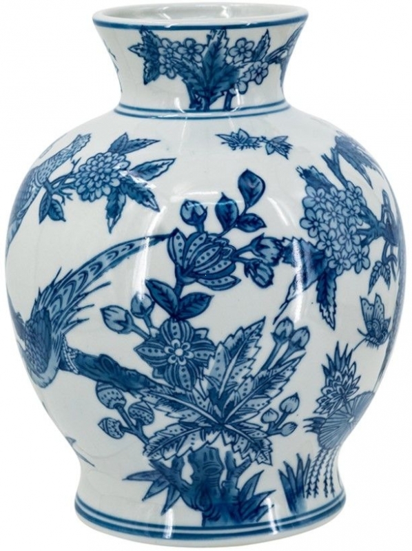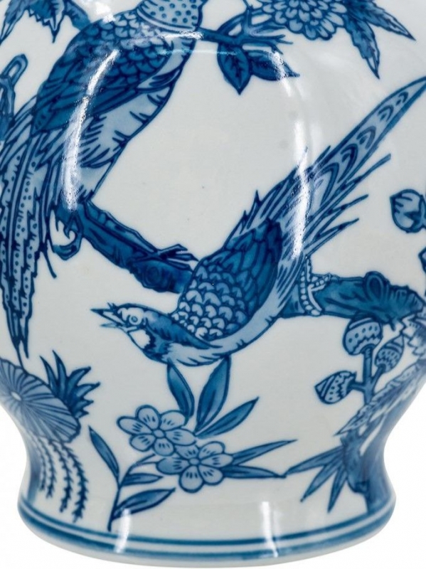 Ваза «Valora» символизирует традицию и элегантность. Стиль, вдохновленный китайским искусством, сочетает в себе утонченность и современность. Цветовая гамма включает нежный белый фон и насыщенные синие детали, которые создают контраст и привлекают внимание. Изготовленная из высококачественного фарфора, ваза обладает гладкой фактурой и тонкими линиями, что подчеркивает ее изысканность. Особенности оформления включают детализированные рисунки с цветами и птицами, создающие ощущение живой природы.