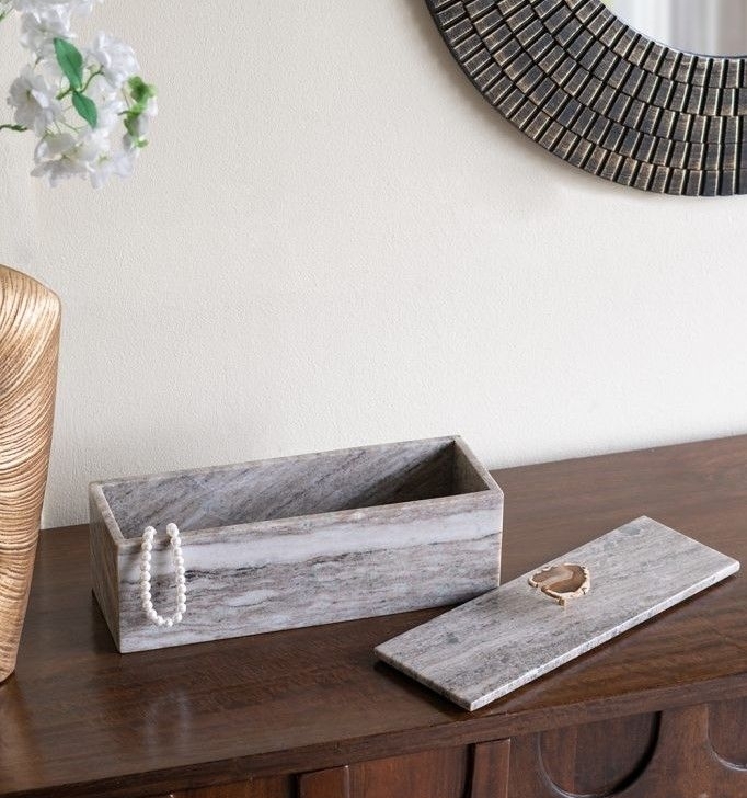 Элегантная мраморная шкатулка с природным рисунком камня превращает хранение украшений в красивый ритуал. Этот вариант идеально подойдет для спальни, гостиной или кабинета и поможет создать атмосферу спокойной роскоши и визуального порядка.