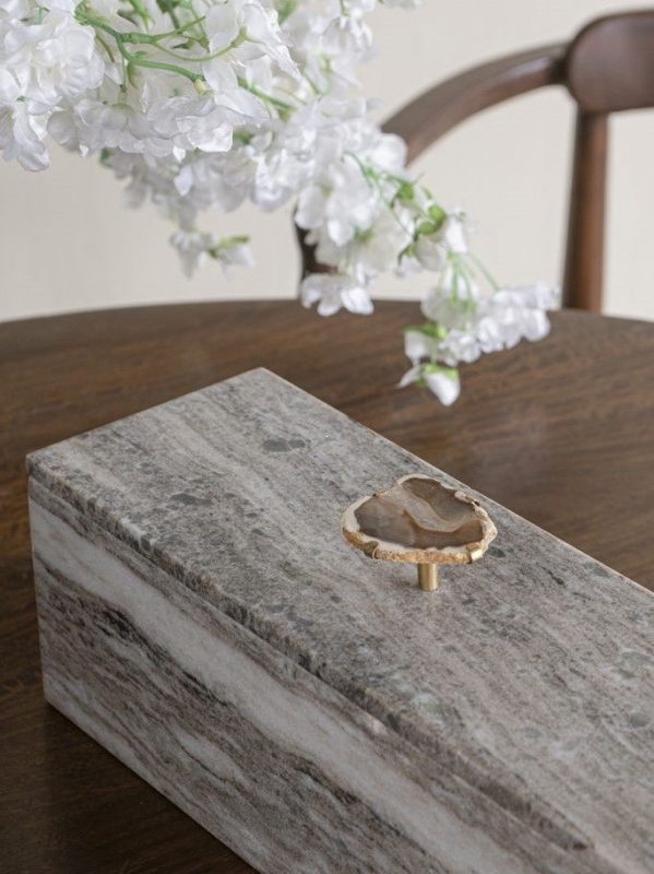 Шкатулка Balor из натурального мрамора в серо-бежевом цвете выглядит сдержанно, дорого и очень тактильно. Прямоугольная форма подчеркивает чистоту линий, а выразительный природный рисунок камня делает каждое изделие визуально уникальным. Поверхность сочетает мягкие дымчатые, молочные и песочно-серые прожилки, благодаря чему шкатулка легко вписывается в спокойные интерьерные палитры. Особый акцент создает ручка из латуни с декоративной вставкой из натурального агата: она добавляет композиции ювелирную тонкость и делает образ более статусным. В интерьере шкатулка работает не только как место для хранения, но и как самостоятельный дизайнерский декор.