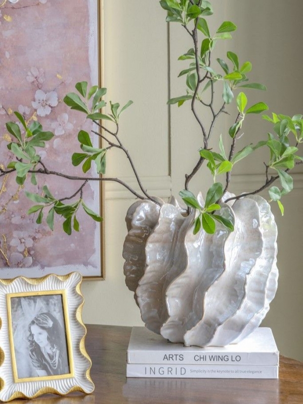 Ваза «Sessions» символизирует связь с природой, ее волнистый дизайн напоминает об океанских волнах и морских раковинах. Стиль — современный, что делает ее универсальной для различных интерьеров. Цветовая гамма включает нейтральные тона: белый, серебристый и серый, что позволяет легко интегрировать ее в любой декор. Изготовлена из высококачественного керамического материала, она обладает гладкой фактурой и глянцевой отделкой, что подчеркивает ее эксклюзивность и роскошь. Ощущения, которые она вызывает — это спокойствие и умиротворение.