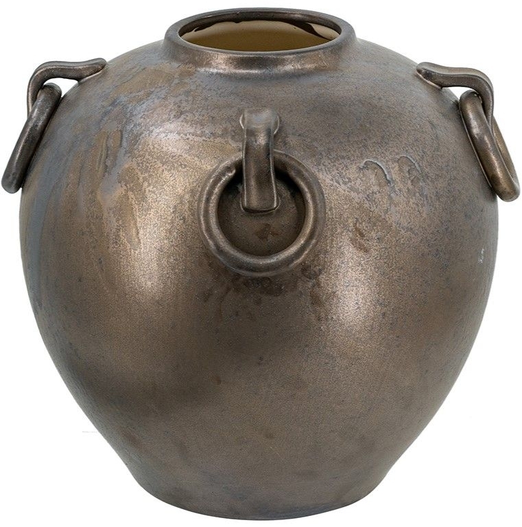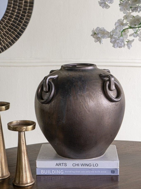 Эта ваза символизирует гармонию между традициями и современностью. Ее округлый силуэт и теплый металлический оттенок создают ощущение уюта и благородства. Бронзовая глазурь с легким блеском придает изделию уникальность, а кольцевые ручки добавляют интересные детали, подчеркивающие его этнический стиль. Материал — керамика, имеет приятную фактуру, что делает эту вазу не только украшением, но и тактильным удовольствием.