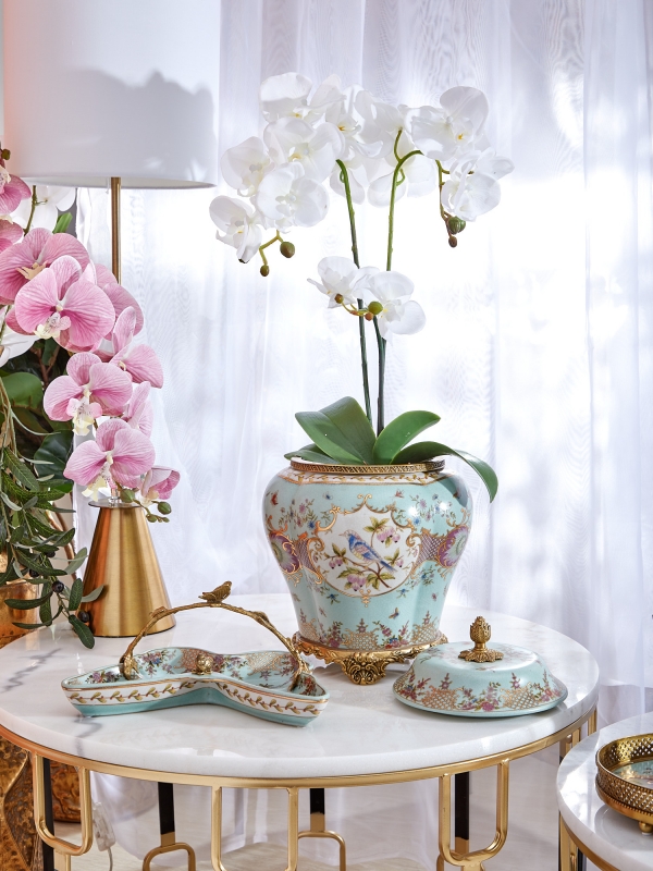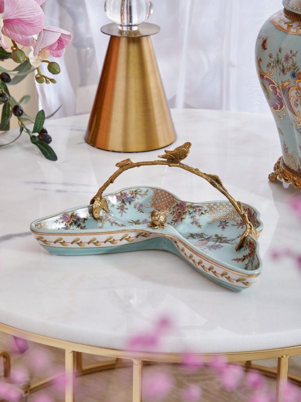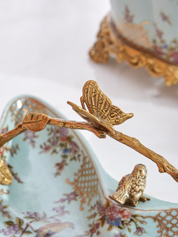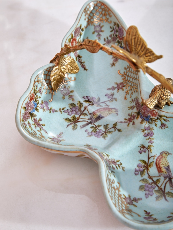 Декоративный поднос Hedviga в нежно-бирюзовом цвете из фарфора с бронзовыми элементами выглядит как коллекционный предмет с тонким художественным характером. Форма блюда плавная, волнообразная, с мягкими изгибами по краю, благодаря чему силуэт смотрится особенно выразительно и декоративно. Поверхность украшена цветочным орнаментом, изящными птицами и золотистыми узорами, которые создают ощущение винтажной роскоши. Бронзовая ручка выполнена в виде ветви с листьями, бабочкой и маленькими птицами, добавляя композиции живость и сюжетность. Лёгкий кракелюр усиливает эффект благородной старины и подчёркивает ручную работу.