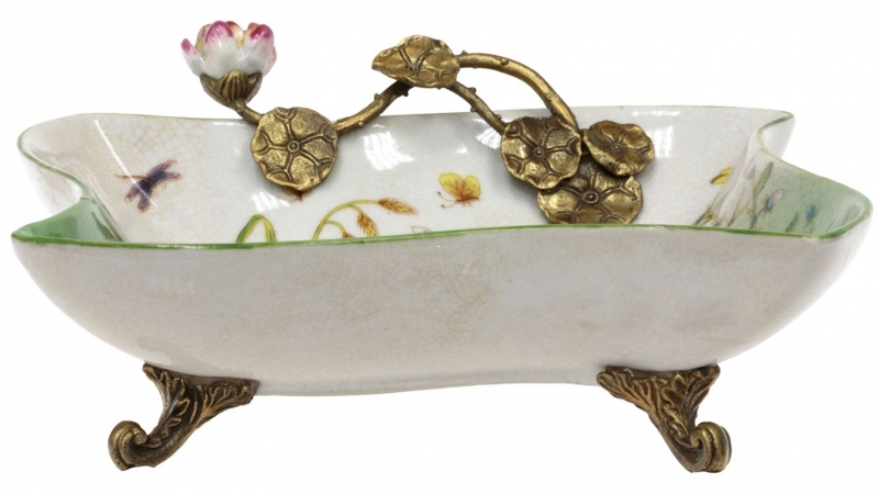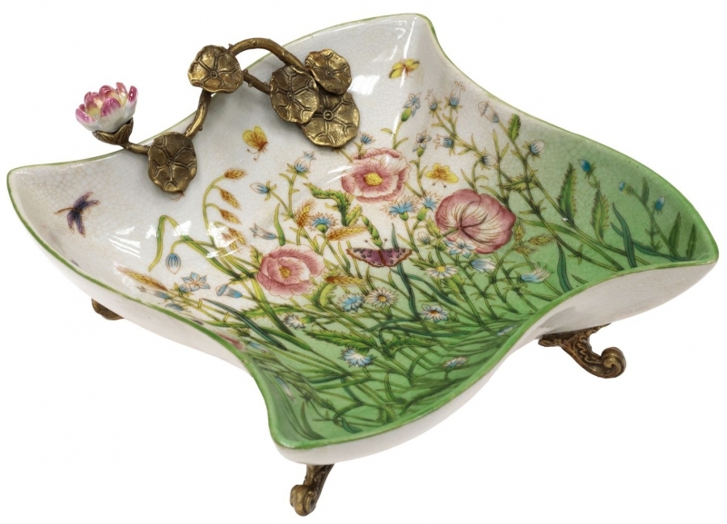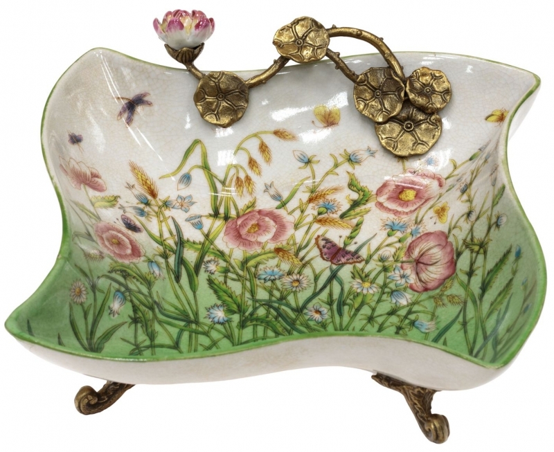 Блюдо декоративное Suizei из фарфора в бело-зелёной гамме с бронзовыми элементами выглядит как художественный объект с тонким восточным настроением. Мягко изогнутый силуэт делает форму живой и пластичной, а ручная роспись с полевыми цветами, травами и бабочками наполняет композицию лёгкостью и ощущением летнего сада. По краю заметен деликатный зелёный кант, который подчёркивает сложную форму изделия. Бронзовый декор в виде стебля с листьями и цветком лотоса усиливает декоративность и добавляет благородный винтажный акцент. Кракелюрная фактура придаёт поверхности глубину и эффект старинного фарфора, благодаря чему блюдо смотрится особенно выразительно в классическом и коллекционном интерьере.