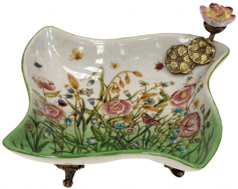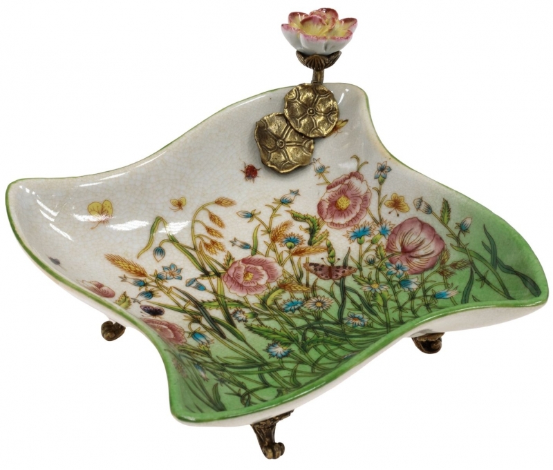 Декоративное блюдо Suizei в молочно-зелёных оттенках из фарфора с бронзовыми элементами выполнено в выразительной художественной манере с восточными мотивами. Плавный, асимметричный силуэт делает форму живой и пластичной, а тонкая роспись с полевыми цветами, травами, бабочками и насекомыми добавляет композиции глубину и настроение. Светлая фарфоровая основа подчеркнута зелёным кантом и мягкими переходами цвета, благодаря чему блюдо выглядит особенно воздушно. Бронзовые ножки, декоративные листья и миниатюрный цветок на краю создают эффект ювелирной отделки. Кракелюр на поверхности придаёт изделию благородный винтажный характер и усиливает ощущение ручной работы.
