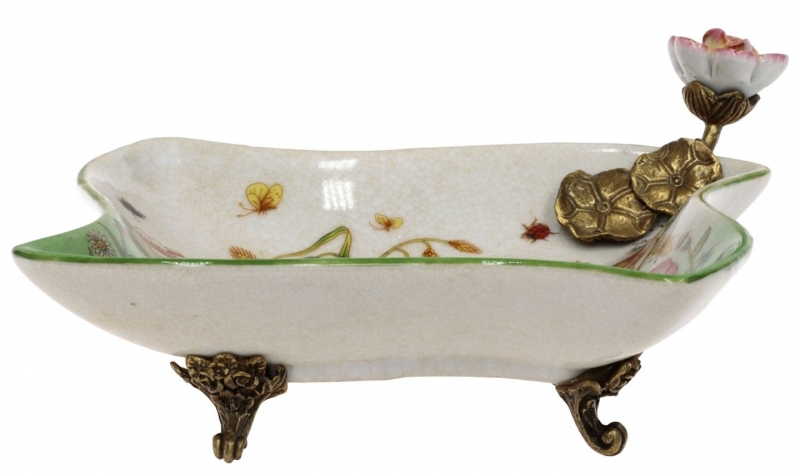 Изящное декоративное блюдо из фарфора с бронзовыми элементами словно хранит настроение старинного сада: тонкая роспись, мягкий кракелюр и цветок-держатель создают ощущение редкой находки. Этот вариант идеально подойдет для гостиной, спальни или кабинета и поможет создать атмосферу уюта, утончённости и тихой роскоши.