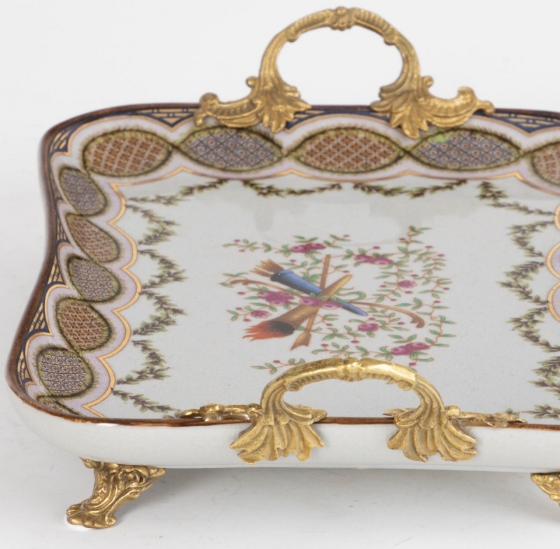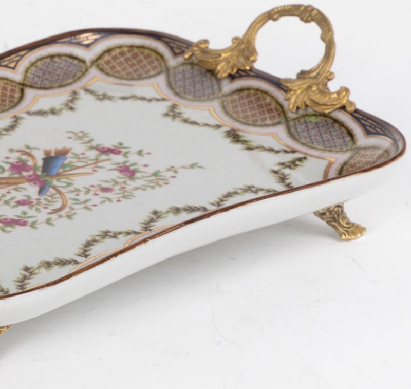 Декоративное блюдо Oden из белого фарфора с бронзовыми ручками и ножками выглядит как изысканный предмет в духе европейской классики с тонким восточным мастерством. Прямоугольная форма со слегка волнистым контуром делает силуэт мягким и выразительным. Края украшены орнаментальным бордюром в золотисто-коричневых, оливковых и приглушённо-синих оттенках, а центральную часть дополняет нежный цветочный мотив с декоративной композицией. Бронзовые ручки и фигурные ножки придают блюду статусный характер, а деликатные кракелюры усиливают эффект старинного художественного изделия. Фактура смотрится живо, тепло и очень декоративно.