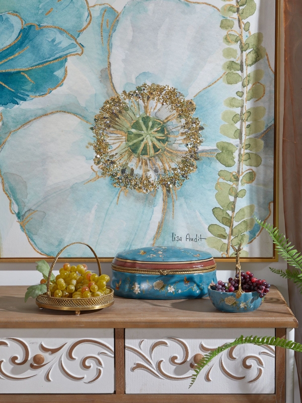 Изящный декоративный поднос с ручкой объединяет нежный цветочный рисунок, воздушную бирюзовую основу и теплый блеск бронзовых деталей. Этот вариант идеально подойдет для консоли, туалетного столика или гостиной и поможет создать атмосферу утончённого уюта.