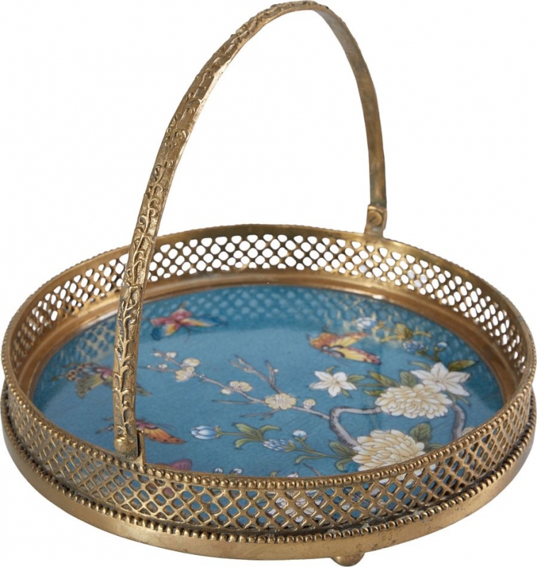 Декоративный поднос Gabriela в бирюзовом цвете из фарфора с бронзовыми элементами выглядит как коллекционный интерьерный акцент с характером старинной вещи. Круглая форма, ажурный металлический бортик и высокая изящная ручка делают силуэт лёгким и выразительным. Внутренняя часть украшена тонким рисунком с цветущими ветвями, белыми цветами и бабочками, благодаря чему поднос смотрится живо, художественно и очень декоративно. Фарфоровая поверхность дополнена эффектом кракелюра, который придаёт фактуре глубину и благородную винтажность. Золотисто-бронзовая отделка мягко подчёркивает голубой фон и добавляет композиции тёплое, уютное звучание.