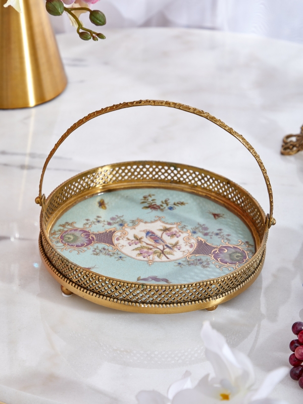 Декоративный поднос Gejza в бирюзовом цвете с фарфоровой основой и бронзовыми элементами выглядит как коллекционный интерьерный аксессуар с благородным винтажным характером. Круглая форма, изящная ручка-дуга и ажурный бортик делают силуэт воздушным и выразительным. Центральную часть украшает тонкая художественная композиция с птицей, цветочными мотивами и деликатными орнаментами в пастельных и золотистых оттенках. Лёгкий кракелюр на поверхности усиливает эффект старинного предмета и добавляет глубину фактуре. Поднос смотрится нарядно, но не тяжело, поэтому легко становится акцентом в интерьере без ощущения перегруженности.