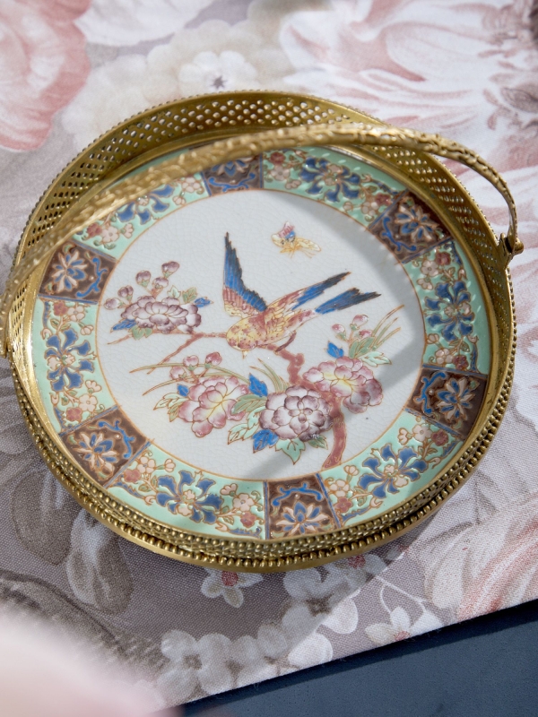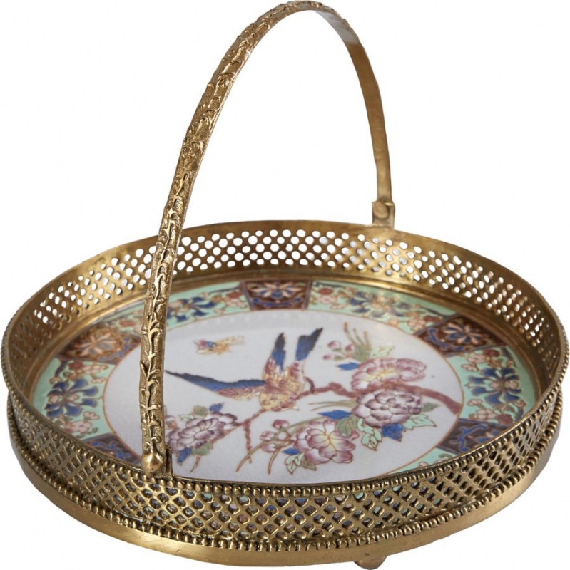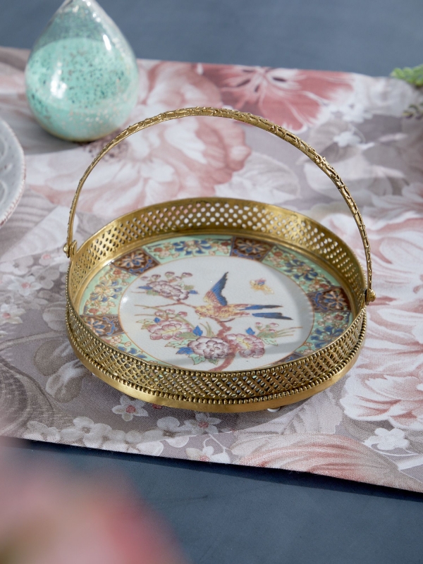 Декоративный поднос Gizela с фарфоровой вставкой, бронзовой ручкой и ажурным металлическим бортиком выглядит как интерьерная вещь с коллекционным характером. Круглая форма делает композицию мягкой и гармоничной, а высокая дугообразная ручка добавляет силуэту выразительность и удобство для сервировочного или декоративного размещения. В центре фарфорового основания — тонкий рисунок с птицей и цветами, обрамлённый орнаментальным кантом в голубых, золотистых и тёплых бежево-розовых оттенках. Металл с бронзовым эффектом подчёркивает винтажное настроение, а кракелюрная поверхность фарфора придаёт изделию благородный эффект старинной ручной работы.
