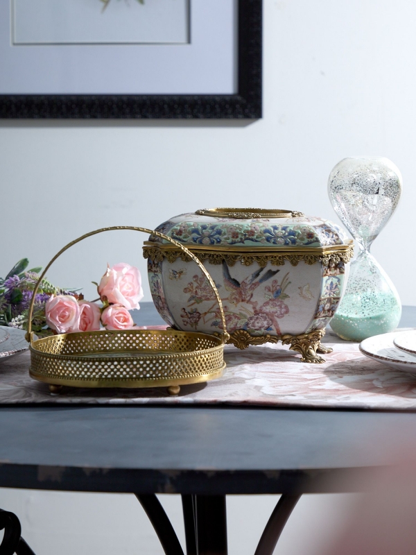 Изящный декоративный поднос с ручкой объединяет тепло бронзового металла и тонкость расписного фарфора. Он идеально подойдет для консоли, кофейного столика или комода и поможет создать атмосферу утончённости, уюта и благородной декоративности.