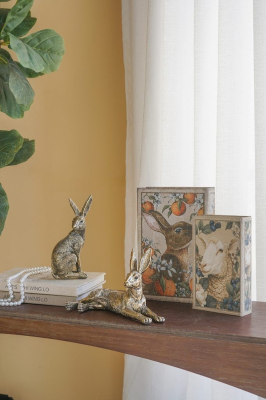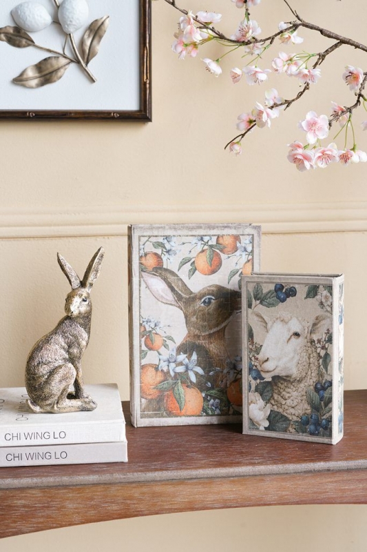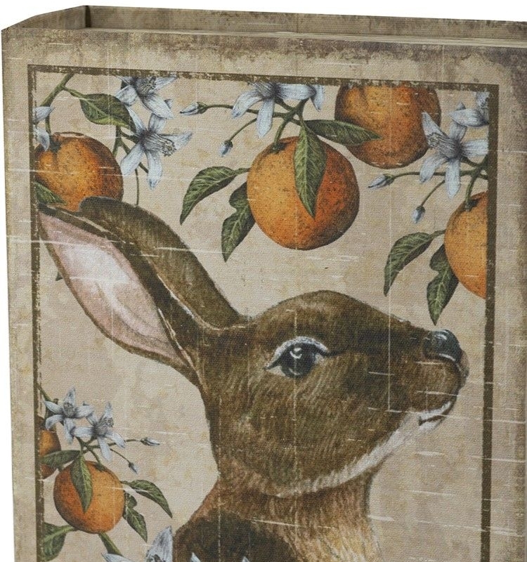 Набор из двух шкатулок в виде книг Bebinn в бежево-песочной гамме с анималистичными и ботаническими иллюстрациями выглядит как коллекция старинных томов с художественным характером. Крышки оформлены изображениями зайца среди апельсинов и белых цветов, а также овечки в окружении ягод и листвы. Боковые части имитируют книжные страницы, благодаря чему шкатулки особенно органично смотрятся на полке, консоли или письменном столе. Состаренная палитра, мягкая матовая фактура и винтажное оформление создают ощущение уюта, ручной работы и тонкого декоративного вкуса. Такой декор не перегружает интерьер, но сразу притягивает взгляд.