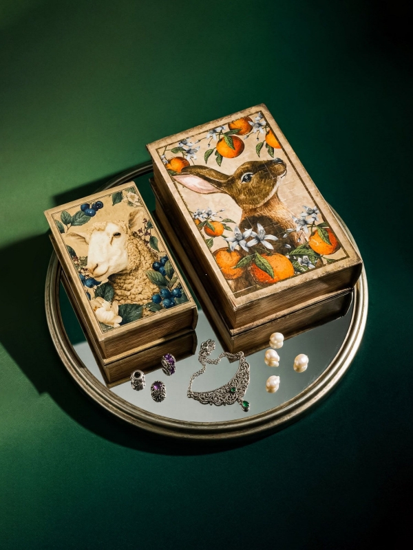 Тёплый, немного загадочный и очень декоративный набор шкатулок-книг превращает хранение мелочей в красивую интерьерную деталь. Иллюстрации с зайцем, овечкой, фруктами и цветами наполняют пространство уютом и помогают создать атмосферу камерной элегантности.