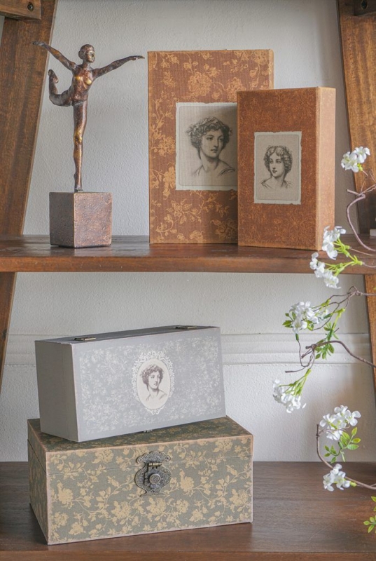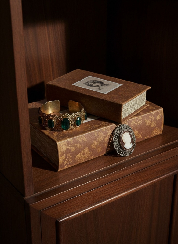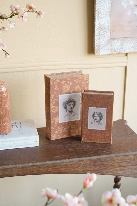 Набор из двух шкатулок в виде книг Beli в коричнево-золотистом оформлении сочетает декоративность и практичность. Композиция выдержана в эстетике винтажной классики: тёплый коричневый фон украшен тонким цветочным орнаментом в приглушённом золотистом оттенке, а на крышках размещены графичные портретные иллюстрации в духе старинных книжных гравюр. Фактура напоминает тканевый переплёт, а боковые части стилизованы под книжные страницы, благодаря чему шкатулки выглядят особенно правдоподобно на полке, консоли или комоде. Такой декор смотрится благородно, мягко и добавляет интерьеру ощущение истории, уюта и собранности.