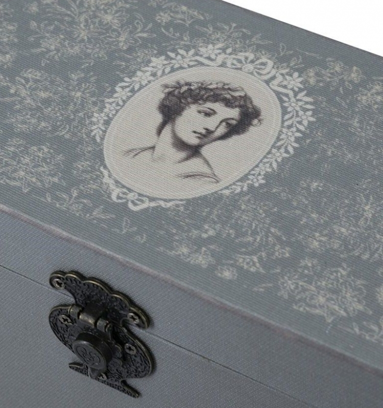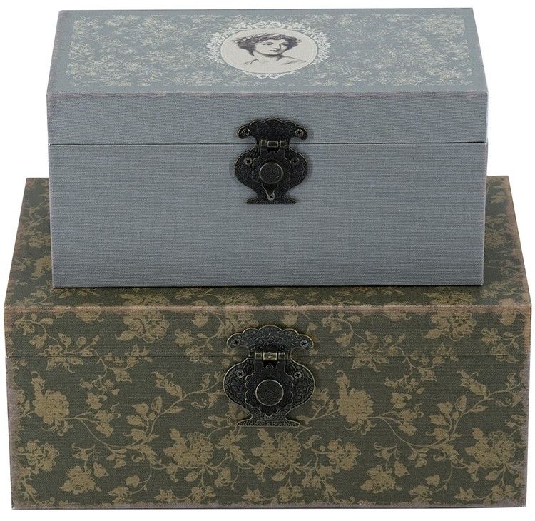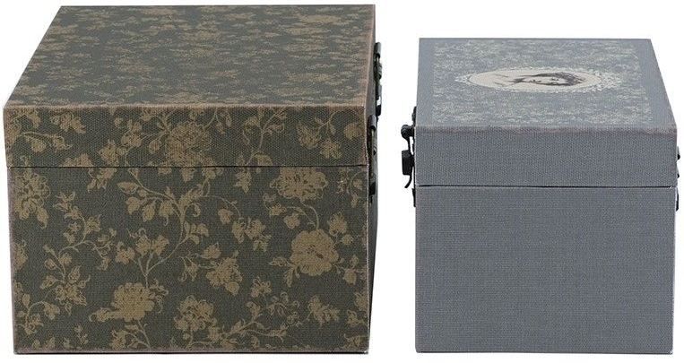 Набор шкатулок Bendigeidfran в серо-оливковых и серо-коричневых оттенках выполнен в винтажной эстетике с мягким романтическим настроением. В комплект входят две прямоугольные шкатулки разного размера: большая украшена деликатным цветочным узором в приглушённых оливково-бежевых тонах, меньшая — в более светлой серой гамме с изящным портретом в овальном медальоне на крышке. Поверхность имеет текстильную, слегка фактурную визуальную отделку, благодаря чему шкатулки выглядят особенно тёпло и тактильно. Металлические замочки с декоративным узором подчёркивают ретро-характер и добавляют ощущение вещи с историей. Внутри шкатулки выглядят аккуратно и вместительно, поэтому сочетают декоративность с реальной пользой в повседневной жизни.