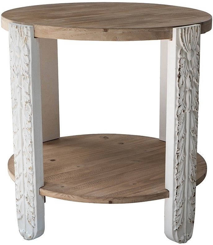 Столик имеет округлую столешницу и широкое основание с нижней полкой, что обеспечивает удобство использования и дополнительное пространство для хранения.