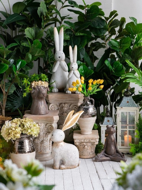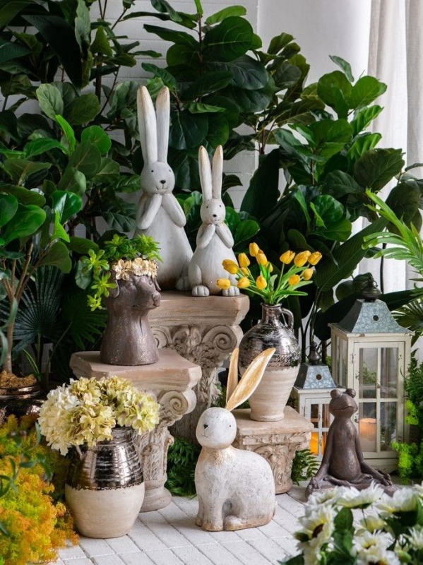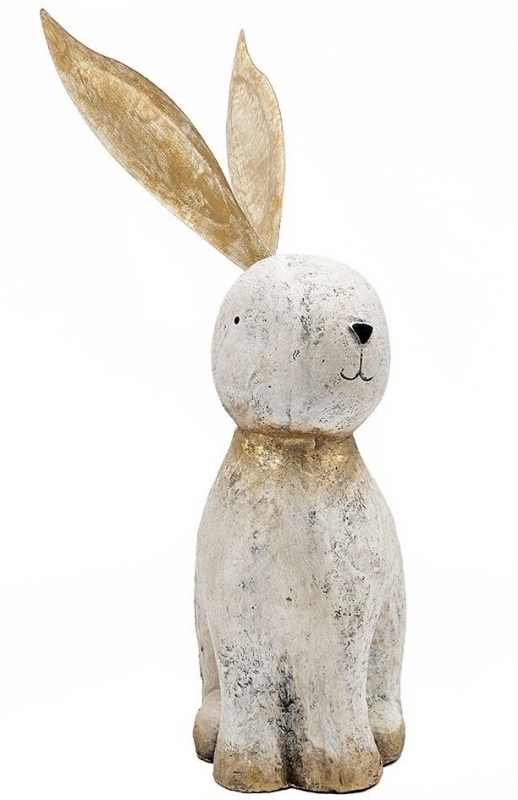 Восхитительный напольный декор в виде игривого зайчика отличается простым округлым силуэтом, текстурированным белым оттенком и съемными длинными золотистыми ушами, которые создают контраст. Дополненный восхитительными чертами мордашки, он украсит любую комнату в вашем доме, если поставить изделие на пол или стол, каминную или книжную полку.