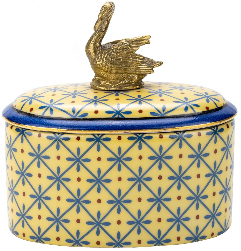 Изящная фарфоровая шкатулка с крышкой превращает хранение мелочей в красивый ритуал. Тёплый кремовый фон, синий орнамент и бронзовый лебедь создают ощущение утончённости и домашнего уюта. Этот вариант идеально подойдет для спальни, гостиной или туалетного столика и поможет создать атмосферу спокойной элегантности.