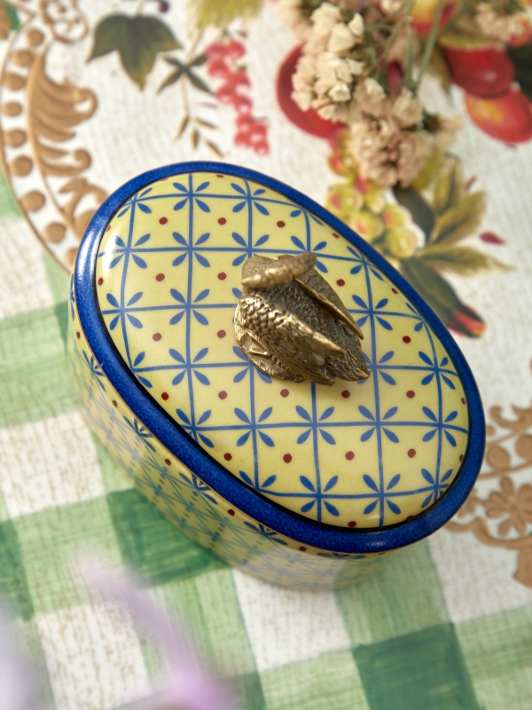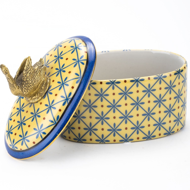 Шкатулка Cleena в кремово-синем цвете из фарфора с бронзовыми элементами выглядит как декоративный акцент с характером и историей. Овальная форма смягчает силуэт, а орнамент из синих геометричных цветочных мотивов и деликатных бордовых точек делает поверхность живой и выразительной. Крышку венчает фигурка лебедя в тёплом бронзовом оттенке — именно она придаёт изделию художественную завершённость и благородный винтажный шарм. Глянцевая фарфоровая поверхность красиво отражает свет, тонкая золотистая окантовка добавляет изысканности, а кракелюрная фактура усиливает эффект старинного предмета, который хочется рассматривать вблизи.