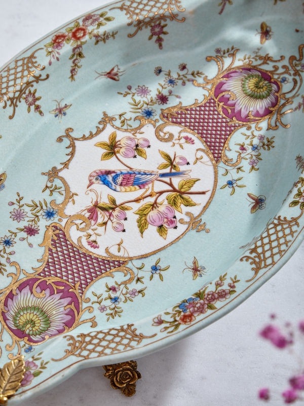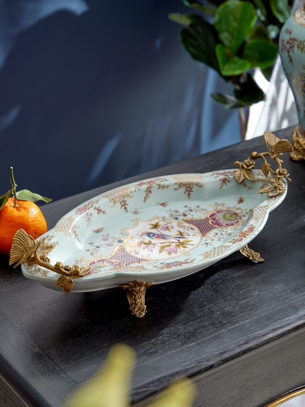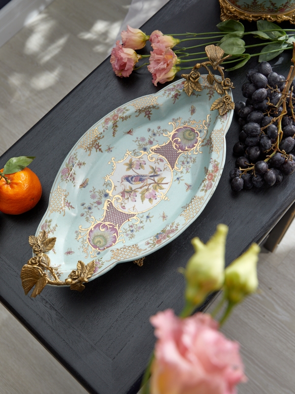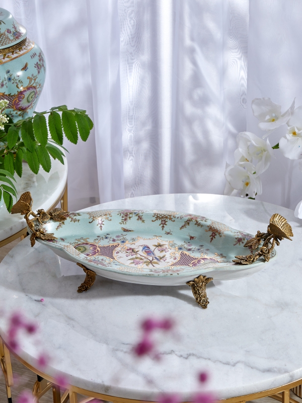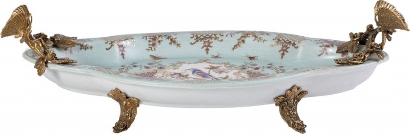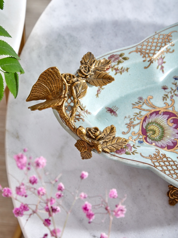 Декоративный поднос Hana в нежно-голубом фарфоре с бронзовыми элементами выполнен в эстетике классического винтажного декора с тонкими восточными мотивами. Вытянутая овальная форма смотрится легко и благородно, а приподнятые края делают силуэт особенно выразительным. Внутренняя часть украшена изящным цветочным орнаментом, бабочками, золотистыми узорами и акцентами в пудрово-лиловой гамме. Бронзовые ручки в виде ветвей с листьями, розами и бабочками превращают поднос в художественный объект, а декоративные ножки подчёркивают его статусный характер. Фактура фарфора дополнена деликатным кракелюром, благодаря которому изделие выглядит как редкая коллекционная находка с историей.