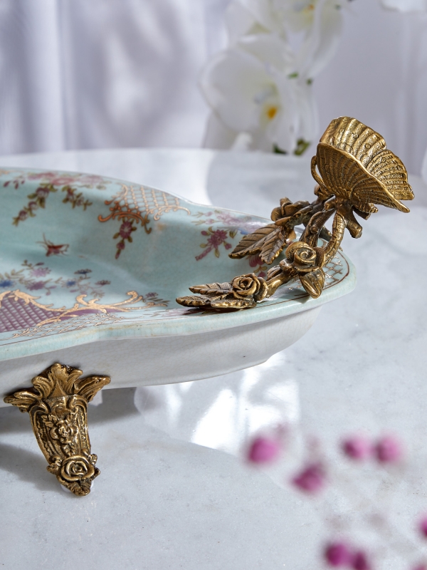 Изящный декоративный поднос с фарфоровой чашей, бронзовыми ножками и фигурными ручками с бабочками добавляет интерьеру тонкую аристократичность. Этот вариант идеально подойдет для гостиной, столовой или консольной зоны и поможет создать атмосферу утончённого уюта.