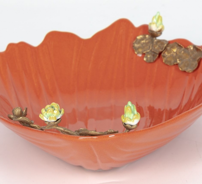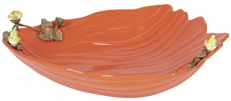 Декоративное блюдо Sindri в терракотово-коралловом цвете из фарфора с бронзовыми элементами выглядит как авторский интерьерный объект с мягкой природной пластикой. Волнообразный силуэт и рельефные линии напоминают лепесток или створку раковины, за счёт чего форма смотрится плавно и динамично. Глянцевая поверхность красиво отражает свет и подчёркивает глубину тёплого оттенка. Бронзовый декор в виде ветви с бутонами и листьев добавляет композиции изящества и создаёт тонкий контраст фактур. Ручная работа делает изделие особенно выразительным, а декоративные кракелюры, выполненные по традиционной технологии, придают облику благородные винтажные ноты и ощущение коллекционной вещи.