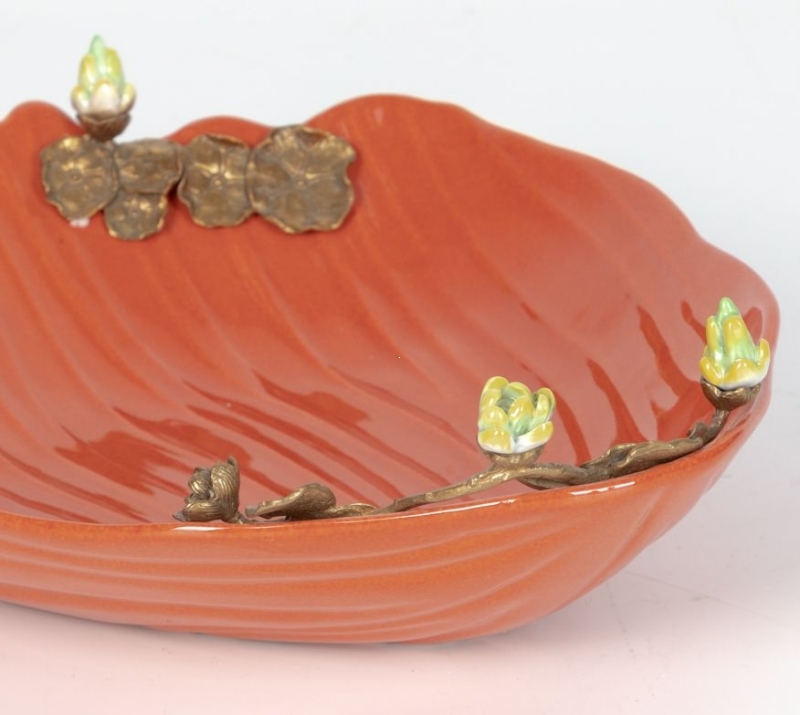 Тёплое, выразительное и очень живое по настроению, это декоративное блюдо соединяет гладкий блеск фарфора, благородство бронзы и тонкую ручную работу. Такой акцент идеально подойдет для гостиной, столовой или спальни и поможет создать атмосферу утончённого уюта с художественным характером.