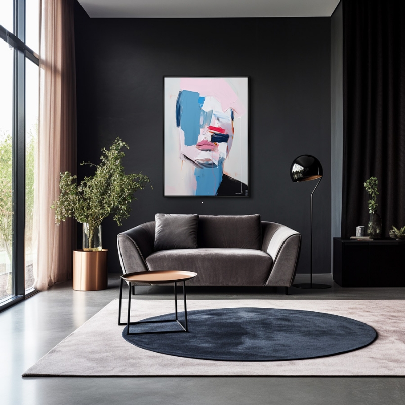 Современный стиль постера сочетает в себе элементы абстракции с яркими и насыщенными цветами: голубым, розовым, черным и белым. Это создает уникальную палитру, которая привлекает внимание и добавляет яркости любому интерьеру.