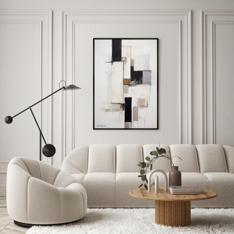 Постер выполнен в современном абстрактном стиле с преобладанием нейтральных оттенков белого, серого и черного, дополненных ярким акцентом оранжевого. Это создает контраст и привлекает внимание, придавая вашему интерьеру свежесть и динамику.
