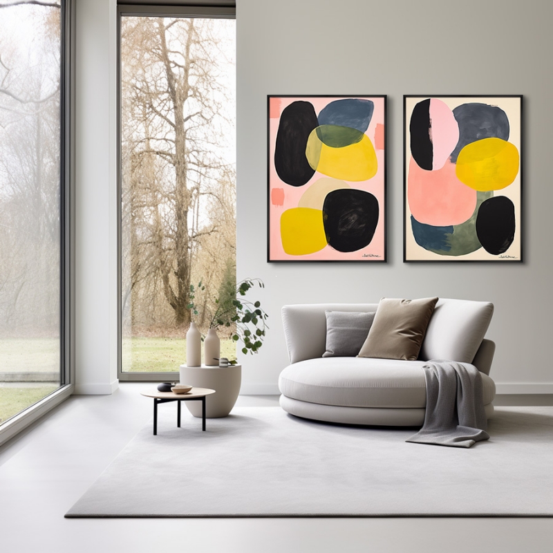 Постеры выполнены в абстрактном стиле, где гармонично сочетаются яркие и пастельные оттенки. Яркие желтые и черные цвета первого постера контрастируют с мягкими розовыми и зелеными тонами второго, создавая визуальную симфонию, которая будет привлекать взгляды.