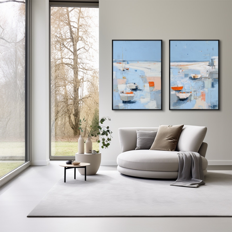 Произведения выполнены в современном абстракционизме, где преобладают нежные голубые и белые оттенки, дополненные яркими акцентами оранжевого и красного. Эта цветовая палитра создает гармоничное сочетание, которое освежает и наполняет пространство жизнью.