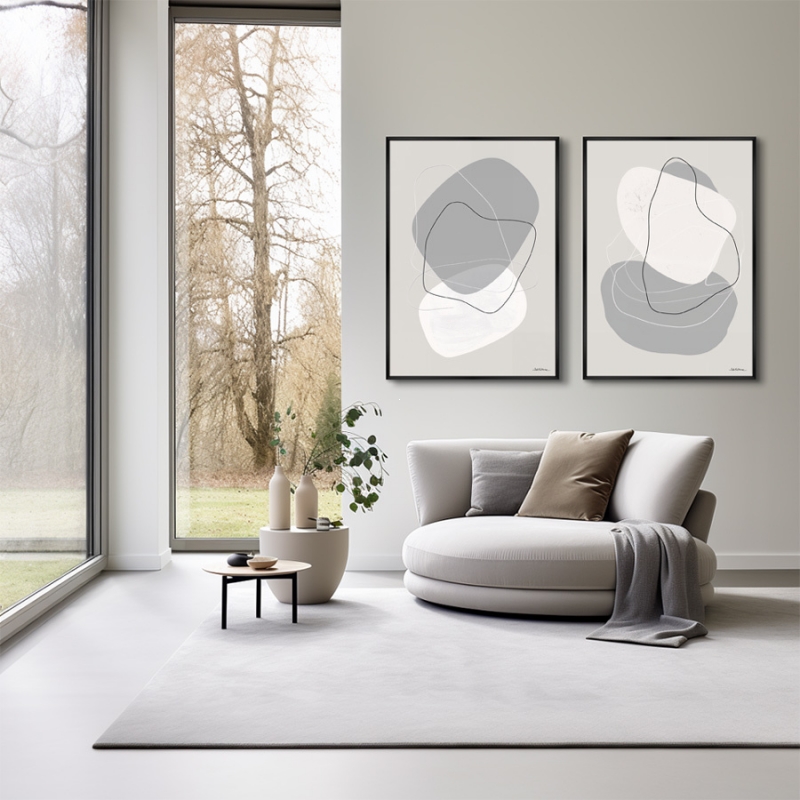 Постеры выполнены в минималистичном абстрактном стиле, с использованием мягких серых и белых тонов. Это сочетание создает гармоничное оформление, которое легко впишется в любой интерьер, добавляя ему элегантности и современности.