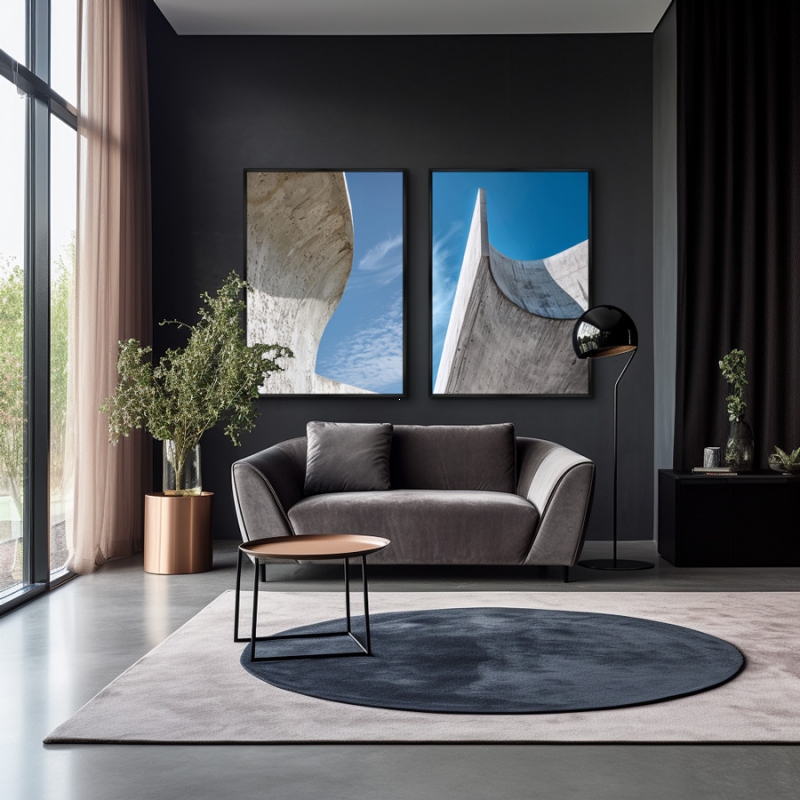 Постеры выполнены в минималистичном стиле, где преобладают оттенки серого, белого и голубого. Яркий небесный фон контрастирует с текстурой бетона, создавая эффект глубины и пространства.
