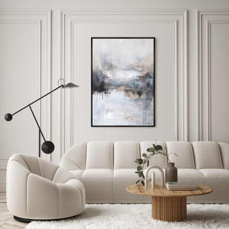 Эта репродукция выполнена в современном стиле, где гармонично сочетаются мягкие оттенки серого, белого и бежевого. Образы зимнего пейзажа, запечатленные на холсте, создают ощущение безмятежности и свежести, словно вы находитесь на живописной зимней прогулке. Высококачественная печать обеспечивает невероятную детализацию и насыщенность цветов, позволяя каждому элементу картины ожить. Холст натянут на прочный деревянный подрамник и оформлен элегантной черной рамой из полистирола, что добавляет изысканности и завершенности.