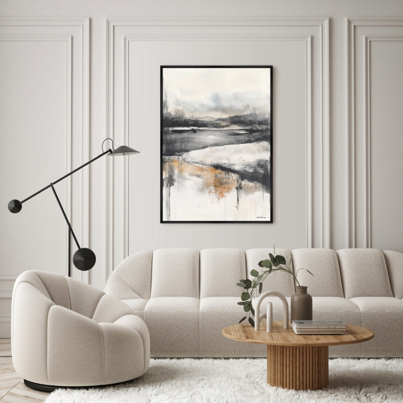 На постере запечатлен живописный ландшафт, который символизирует переход от зимы к весне. Мягкие линии и размытые границы создают ощущение легкости и воздушности. Художественный стиль сочетает в себе элементы современного искусства с акцентом на минимализм, а цветовая гамма — это комбинация серых, черных и теплых оранжевых оттенков, что придает изображению глубину и выразительность. Репродукция напечатана на холсте из хлопка с высокой детализацией, что позволяет всем оттенкам раскрыться в полной мере. Особое внимание уделено оформлению: холст натянут на деревянный подрамник и обрамлен стильной черной рамой, что завершает общий вид и делает картину готовой к размещению.