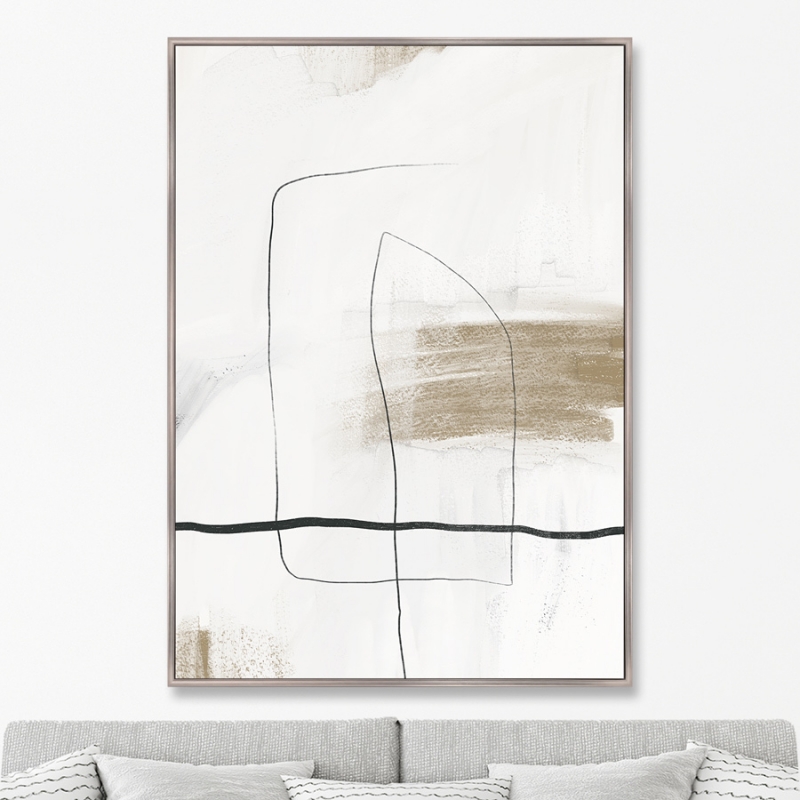 Работа выполнена в минималистичном абстрактном стиле, где преобладают светлые и нейтральные оттенки: белый и бежевый, дополненные контрастными черными линиями. Эта палитра идеально впишется в любой современный интерьер.