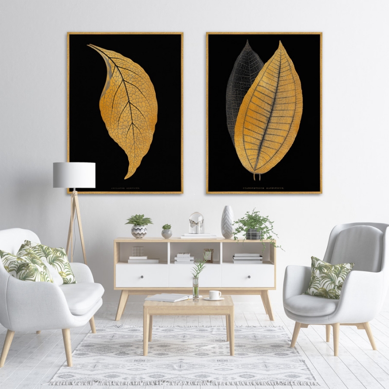 Каждый постер в этой композиции представляет собой уникальное изображение листьев, выполненное в золотистых тонах на фоне глубокого черного. Листья символизируют связь с природой и её красоту, а их детализированное исполнение передает ощущение утонченности и элегантности.