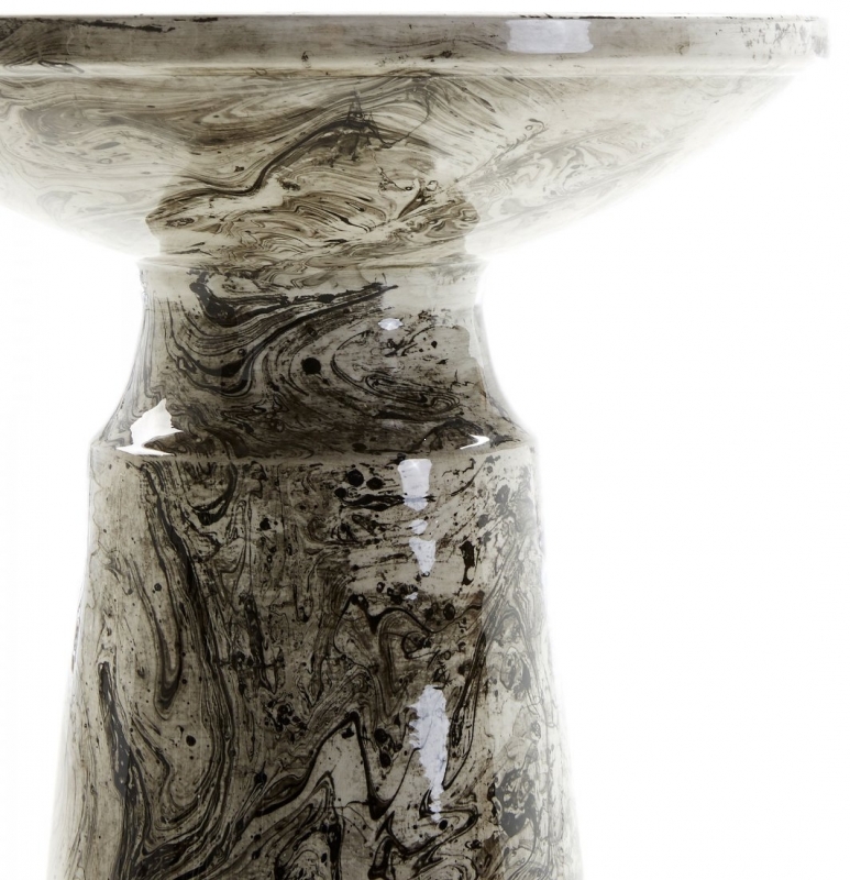 Столешница и основание выполнены из металла с отделкой под натуральный мрамор. Эмалевая поверхность обеспечивает долговечность и износоустойчивость, что делает этот столик идеальным для повседневного использования. Прожилки и естественный рельеф придают ему уникальность.