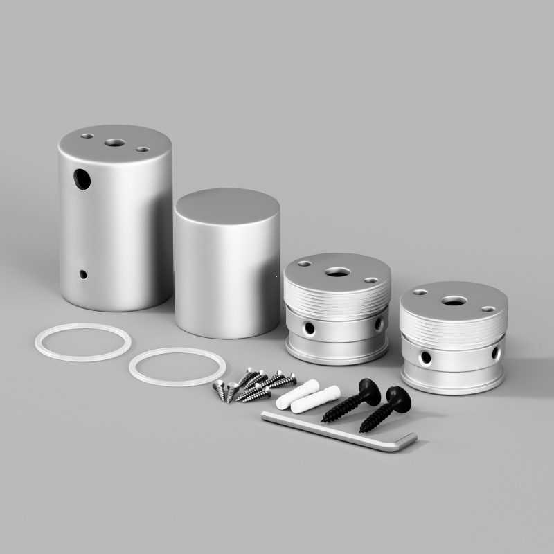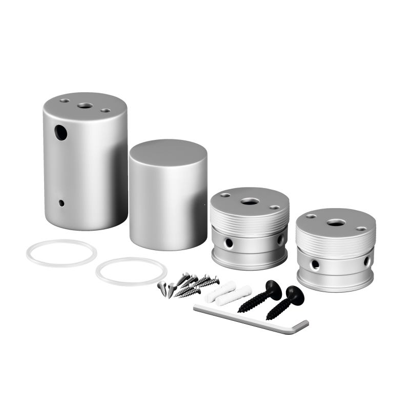 Комплектующие выполнены из алюминия с серебристым покрытием, что придает им современный и стильный вид. Их округлая форма и аккуратные линии делают их идеальными для использования в различных интерьерах, добавляя нотку элегантности.