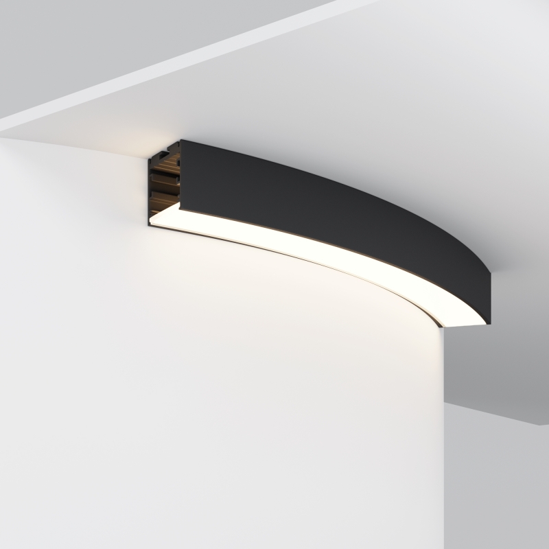 Профиль выполнен в изящной радиусной форме, что придает ему уникальность и современный вид. Цвет — классический черный, который легко впишется в любой интерьер. Изготовлен из качественного алюминия, что обеспечивает прочность и долговечность. Форма профиля позволяет создавать плавные линии света, подчеркивая стиль помещения. Его гладкая поверхность и минималистичный дизайн делают этот элемент незаменимым для тех, кто ценит элегантность и современность в интерьере.