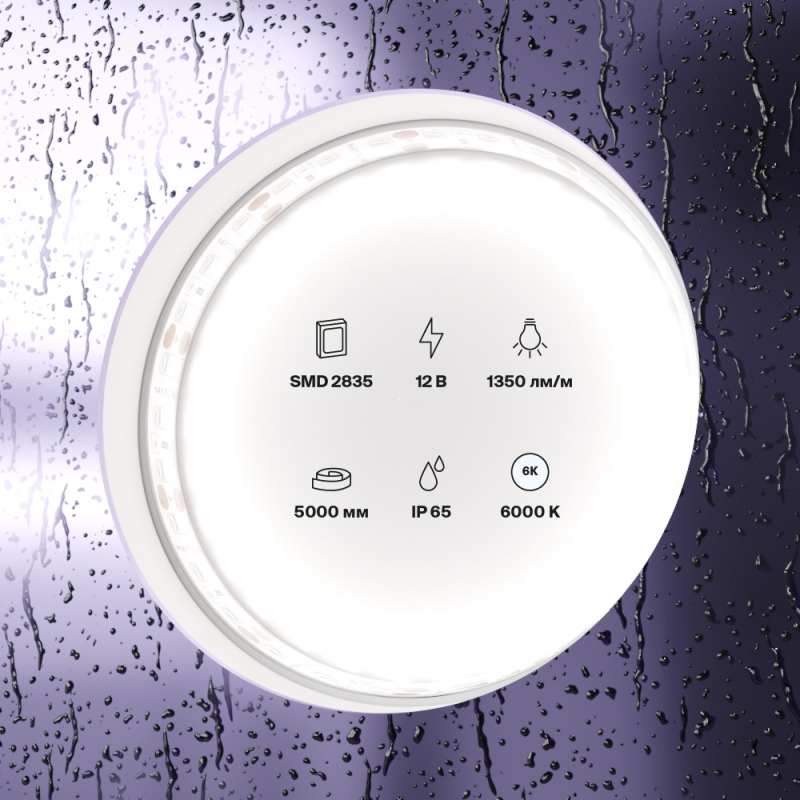 - Светодиодная лента 12В 2835 14,4Вт/м 6000K 5м IP65