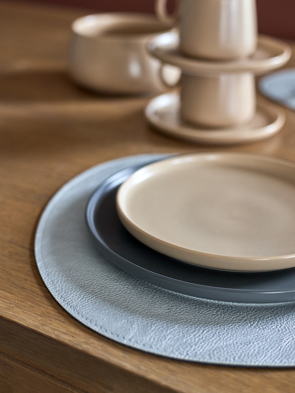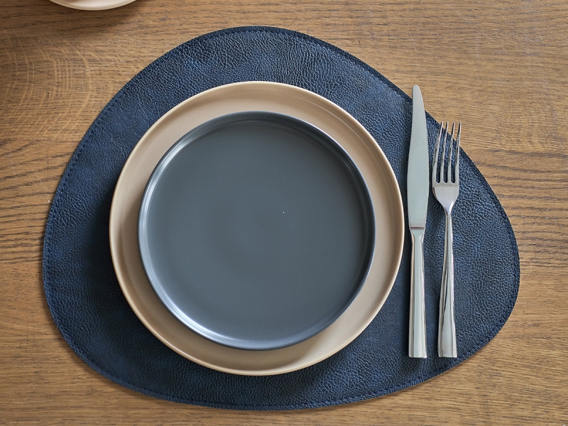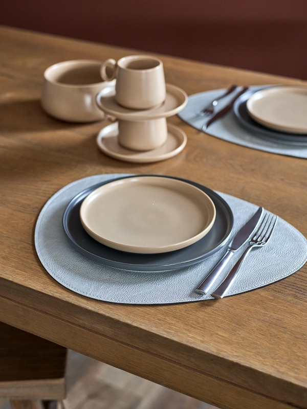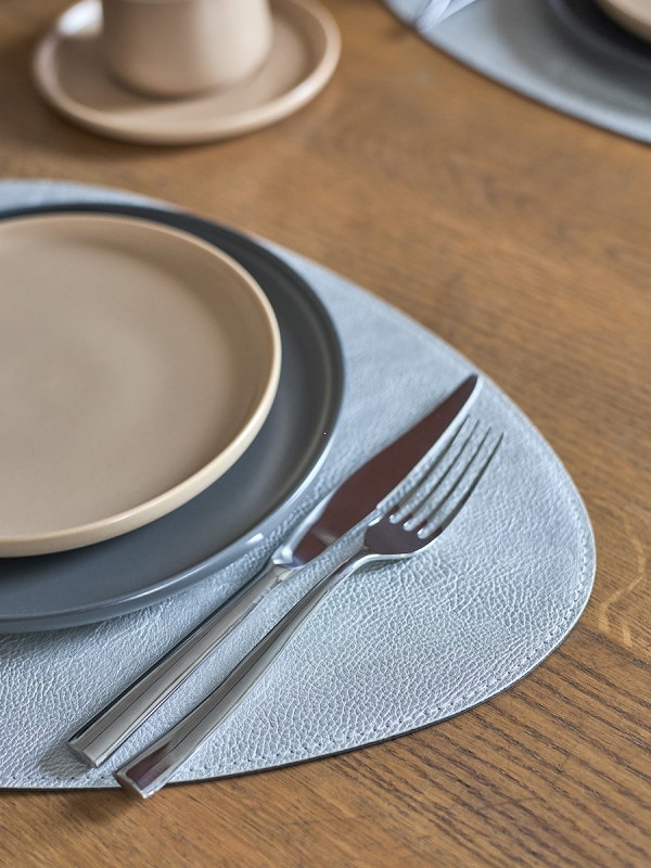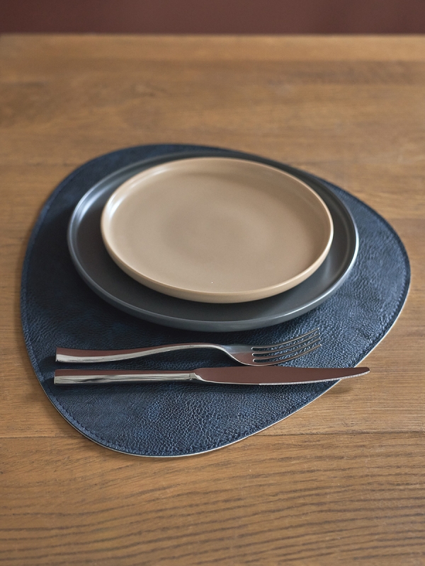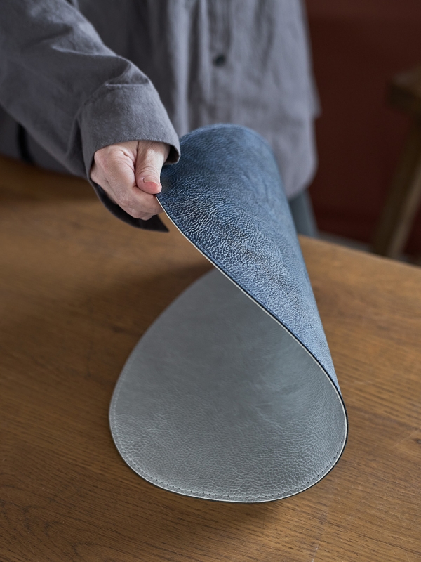 Плейсматы «Drop» имеют оригинальную каплевидную форму, что делает их не только эстетически привлекательными, но и функциональными. Их цветовая гамма: синий с одной стороны и светло-серый с другой, позволяет легко переключаться между стилями и настроениями. Материал из экокожи ПВХ не только приятен на ощупь, но и устойчив к повреждениям, что делает плейсматы идеальными для повседневного использования.