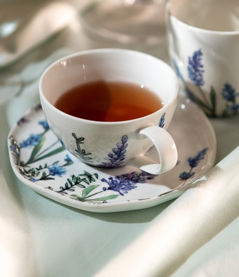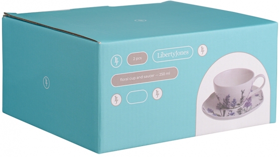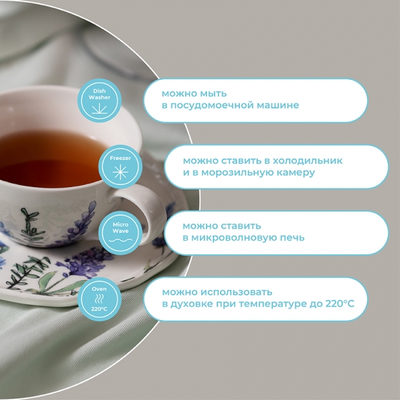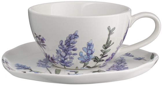 Чашки с блюдцами из коллекции Floral – прекрасный вариант для всех, кто ценит сочетание качества и эстетики. Цветущая лаванда, изображенная на белоснежной поверхности, превращает посуду в настоящее украшение стола. Такая чайная пара идеально подходит для уютных чаепитий в стиле кантри и прованс. Материал изготовления неприхотлив в уходе, не впитывает загрязнения, является экологичным и безопасным для здоровья. Чистое сырье высочайшего качества и собственная формула глазуровки с обжигом при температуре 1250 °C делают изделия из фарфора особо прочными, устойчивыми к растрескиванию и появлению сколов. Глазурь и декор не тускнеют со временем, сохраняя первоначальный цвет и блеск. Наши продукты прошли испытания на отсутствие в составе свинца и кадмия в соответствии со стандартными тестами FDA. Материал: фарфор. Объем чашки: 250 мл. Диаметр блюдца: 16 см. Количество предметов в наборе: 4 шт. Посуду рекомендуется очищать от загрязнений в теплой воде с помощью мягкой губки с жидким средством. Допускается мытье в посудомоечной машине, использование в морозильной камере, микроволновой печи и духовке при температуре не выше 180 °C.