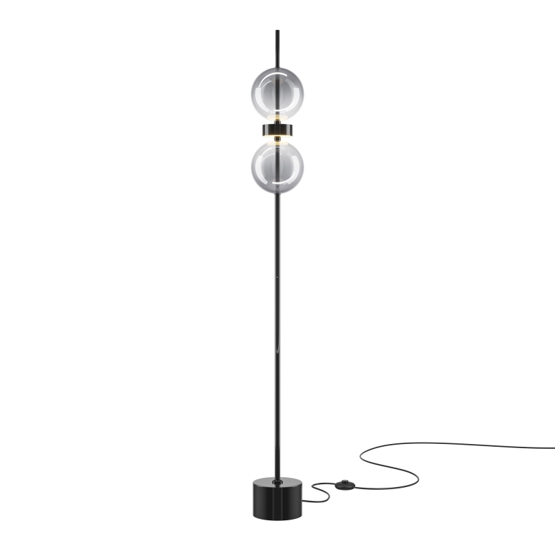 Напольный светильник Double Moon выполнен в современном минималистичном стиле. Его черная металлическая конструкция гармонично сочетается с дымчатыми стеклянными абажурами, создавая эффектный контраст. Высокая стойка и округлая основа придают ему стабильность и элегантность, а прозрачные плафоны обеспечивают мягкое, рассеянное освещение, добавляя пространству легкости и воздушности.