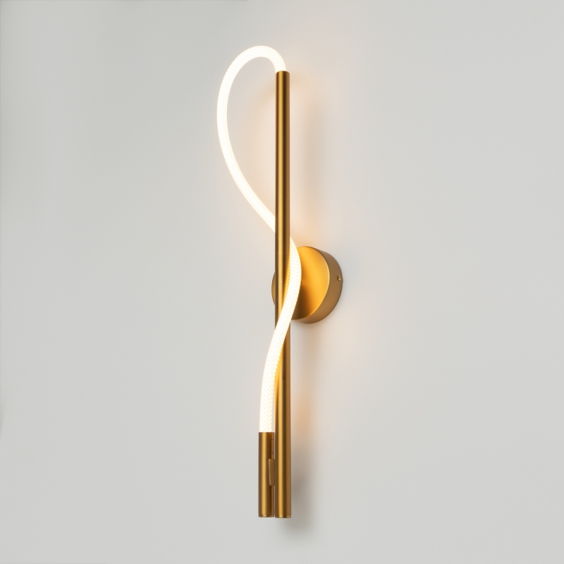 Светильник обладает уникальным дизайном с плавными линиями, подчеркивающими его современный стиль. Золотой алюминиевый корпус великолепно сочетается с белым текстильным абажуром, создавая стильный контраст. Высококачественные материалы и внимание к деталям делают этот светильник не только функциональным, но и стильным элементом декора.
