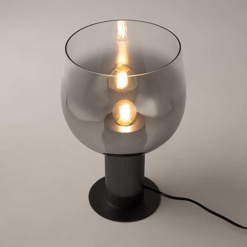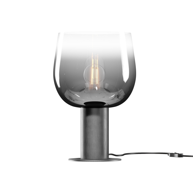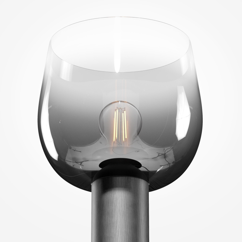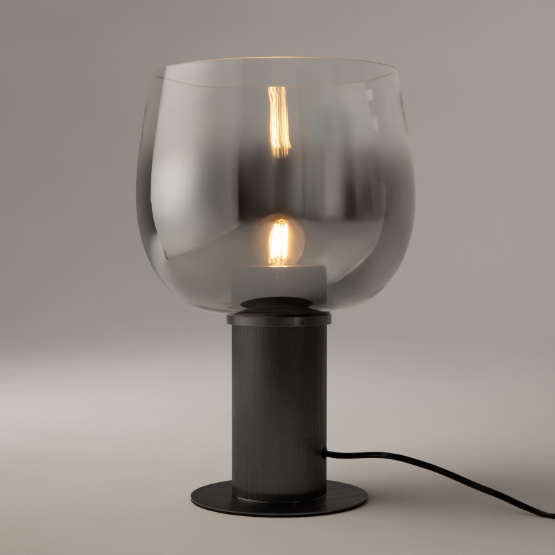 Настольный светильник выполнен в современном минималистичном стиле. Уникальная форма абажура в дымчатом цвете придаёт ему эффектный вид, а черный алюминиевый корпус добавляет строгости и элегантности. Стеклянный абажур создает интересные световые эффекты, наполняя пространство мягким светом. Этот светильник станет отличным акцентом в любом интерьере.