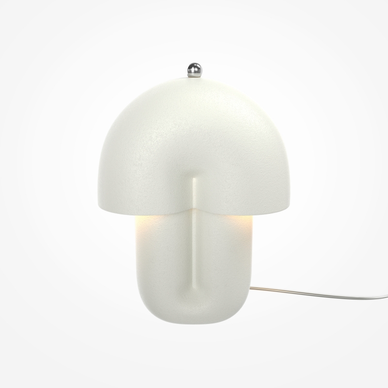 Светильник имеет уникальную конструкцию в форме «грибочка», выполнен из высококачественной керамики с текстурированной поверхностью. Белоснежный цвет придает ему свежесть и легкость, а округлые формы создают ощущение уюта. Металлический переключатель в верхней части добавляет современный штрих, подчеркивая стильный дизайн.